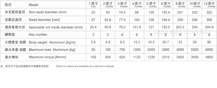 通長鍵條式氣脹軸,收放卷都可適用,多氣囊式設計,氣囊長度與氣漲軸主體相似。